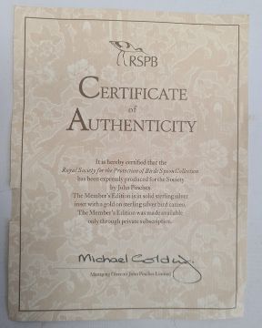 Set of 12 silver spoons from the RSPB Spoon Collection, each spoon with a silver-gilt finial depicting a different bird, with certificate, in fitted case, approx. 10oz