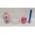 Pink and white satin glass vase with trefoil rim, 11cm high, an opalescent and moulded glass bowl embossed three doves, 19cm diameter, bearing registration number, a pink opaline glass vase, bird decorated and a Whitefriars blue and clear glass spill vase (4)