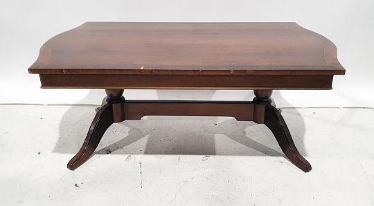 20th century mahogany coffee table on turned end pillar supports united by stretcher, 122cm wide