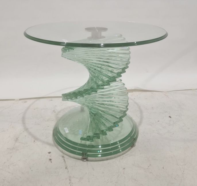 Circular glass coffee table on stepped spiral glass column and circular base, 59.5cm diameter