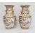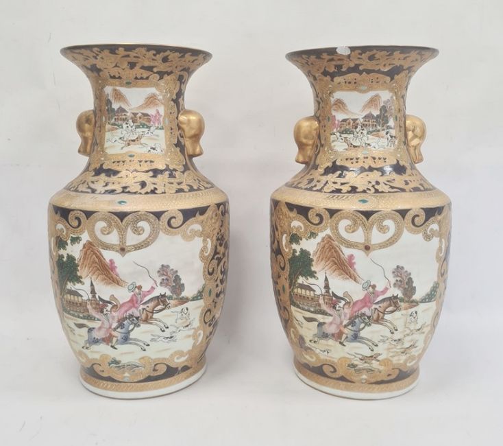 Pair of Chinese porcelain vases, each angular baluster shape and painted in panels with hunting scenes on a blue and gilt ground, 47cm high