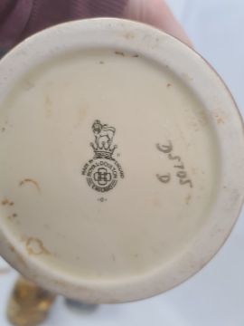Royal Doulton Queensware tankard with rally on Plymouth Hoe,  Doulton Burslem Jacobean pattern ochre glazed jug, and a German salt glazed stoneware two handled baluster vase, impressed with scrolling floral branches enriched in dark blue glaze, 26.5cm high (3)