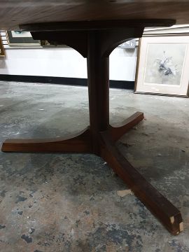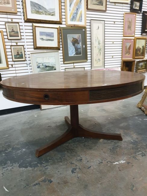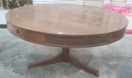 Archie Shine for Heal's circular centre table in rio rosewood, four drawers to frieze on cylindrical pedestal, three feet, Sites No. 598813/01, 145cm dia.Condition ReportImages attached.Occasional scratches to table top. Some edge wear around table.Damage to two feet.