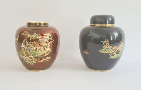 Two Carltonware ginger jars and a cover, printed marks, the first painted on powdered dark blue ground with a chinoiserie pavilion and figures, with cover, 17cm high and the second with a ruby lustre ground with similar chinoiserie vignettes, no cover (2)