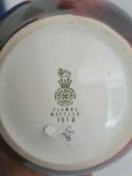 Royal Doulton veined flambe vase, printed black mark, No. 1616, impressed marks, 26cm high and another Royal Doulton mottled flambe vase of bottle form, No. 1618, 26cm high (2)