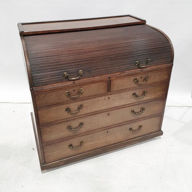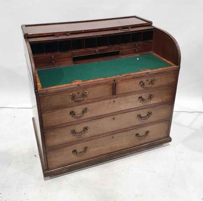 19th century mahogany roll-top desk with fitted interior above two short and three long graduated drawers, plinth base to castors, 106.5 x 102cm