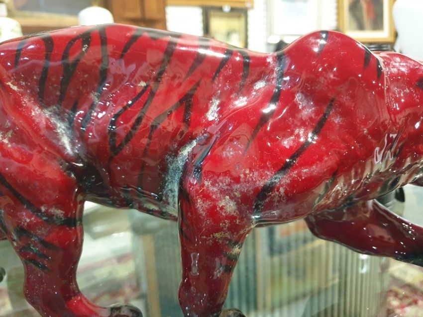 Royal Doulton flambe large tiger, 35cm x 36cm approx. Condition ReportWhite/cream gunk like substance mainly on the reverse. Appears to remove with nail. Attention requiredNo visible cracks or chips.Minor scratching on the reverse.