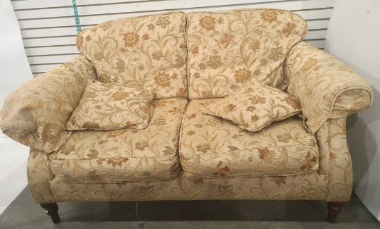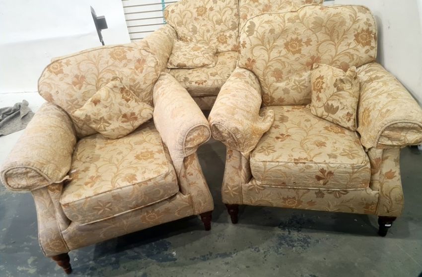 Modern three piece suite comprising a two seater sofa and two armchairs in brown floral upholsteryCondition ReportSofa Approx. Dimensions: 154cm x 89cm x 82cm (51cm to seat).
