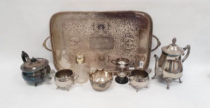 Plated three-piece teaset, a large silver plated two-handled tray of rectangular form with pierced gallery, assorted cutlery, etc.