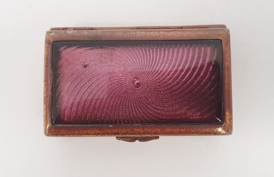 A brass lacquered and purple guilloche enamel cachou box, 4.7cm x 3cm