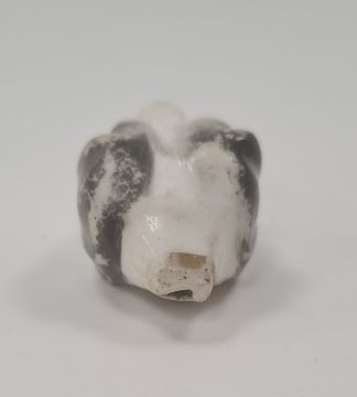 19th century English porcelain miniature dog’s head whistle, enriched in black and brown enamel, 5.5cm long (rubbed and worn)