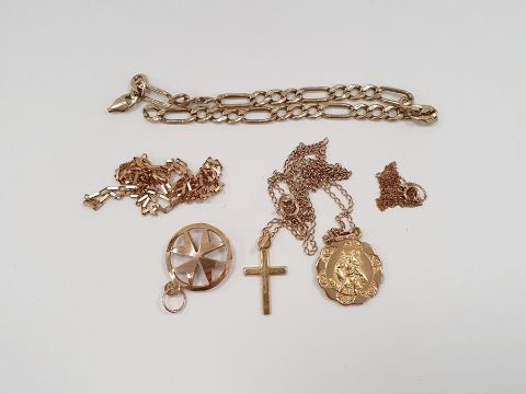 9ct gold box link chain, an Italian gold curb link bracelet marked 9ct, a 9ct gold Maltese cross pendant, a fine curb link chain marked 375 and another gold chain hung with a cross pendant and a St Christopher pendant, total weight approx. 10.6g