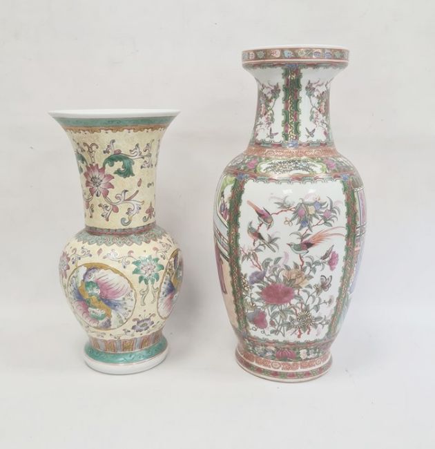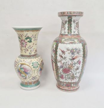 Two Chinese porcelain vases, 20th century, red character marks, the first Cantonese painted with panels of figures before buildings and birds and branches of flowers, 47cm high, the second with tall everted neck, painted with panels of chrysanthemum and stylised petals and scrolls reserved on a pale yellow ground (2)