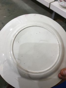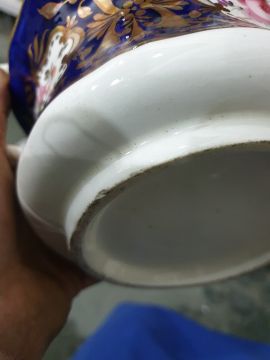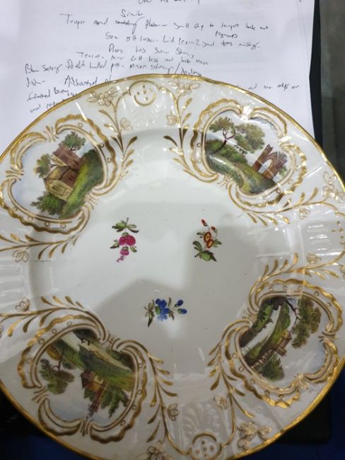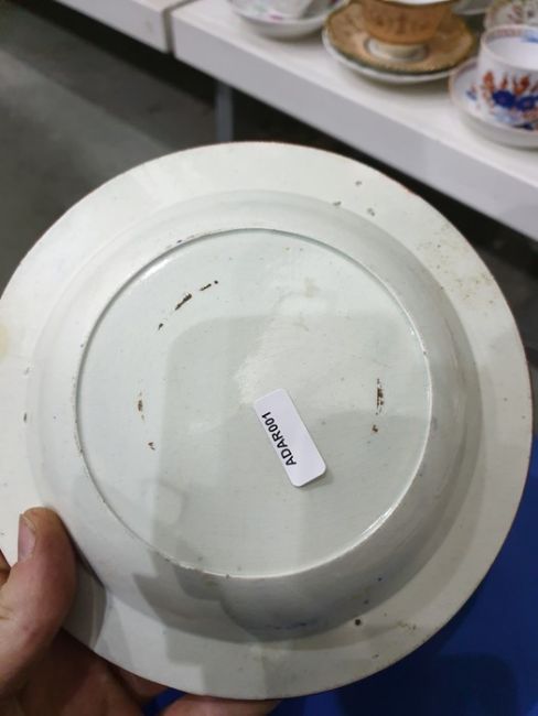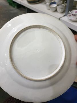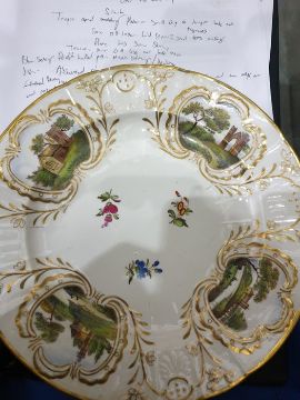 Collection of English pottery and porcelain plates and dishes,  circa 1815 and later, including a blue ground teapot and cover painted with bouquets of flowers, a Derby plate similar with gadrooned border, two breakfast cups and two plates with burnt orange border with flowerheads and gilt tendrils, a spirally moulded plate painted in sepia with fruiting vine, a bat printed mug and other items of printed pottery Condition ReportBreakfast cups and matching plates - Some rim wear. Base wear. Some gilt loss. 1 plate has minor crack and stain/imperfection. Other plate has broken and been repaired.Teapot and simliar plate - Small chip to teapot base, some gilt loss. Lid repaired 2 gaps. Plate has some staining.Matching teacup- Minor gilt loss and base wear.Blue serving dish - Broken and repaired.Double handled pot - Minor stainingAssorted plates - Most have some base wear and small chips or staining. Varied (see picture for individual conditions).Little fishers mug - Staining, base wear and cracked rim.Duck scene mug - Staining base wear.
