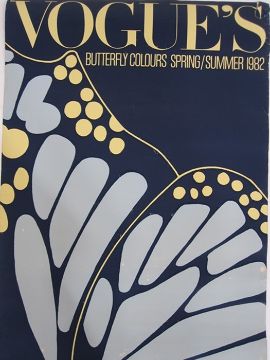 Vogue Spring/Summer 1982 poster "Butterfly Colours" in blue and yellow, Vogue poster Spring/Summer 1983 poster "Rose Complexion Colours", Biba Poster 'Ingrid Boulting', photographed by Sarah Moon ( 1971) and an Edwardian colour fashion print showing various bustle dresses, 35cm x 25cm (4)