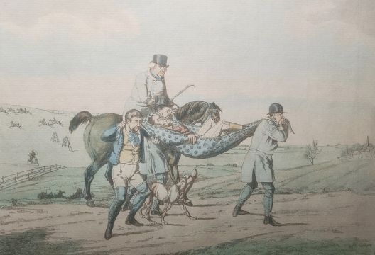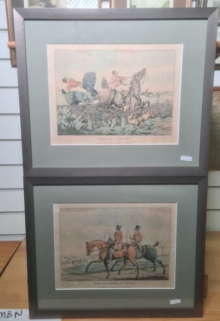 After Henry AlkenSix hand coloured etchings, 'Going at a chalk pit, gravel pit or river', 'Going at a fence', 'How to appear at cover', 'How to stop your horse', 'Going home' and 'Going at a gate' (6)