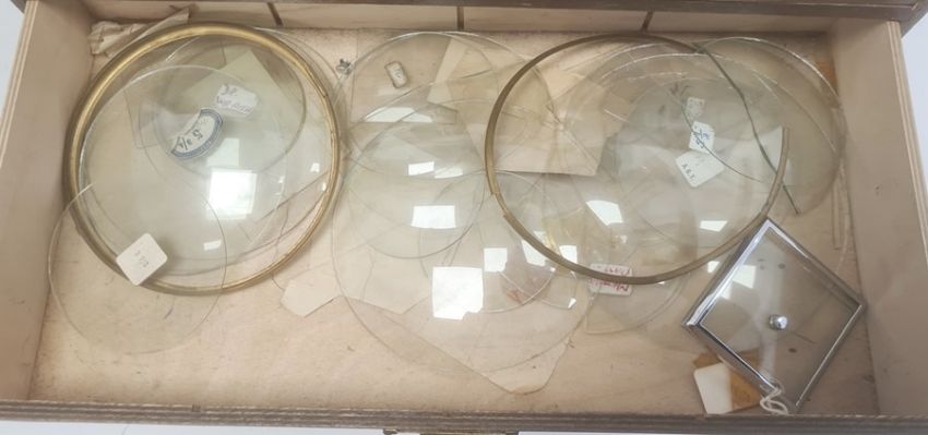 Five-drawer table-top cabinet containing watch springs, parts and clock faces, etc