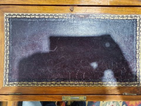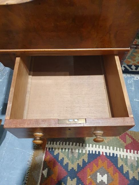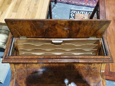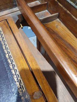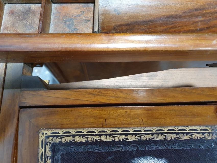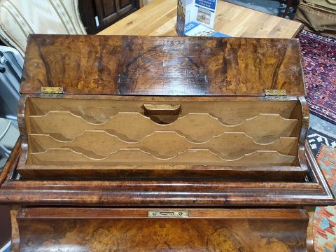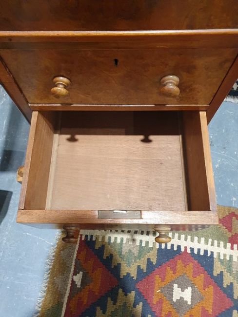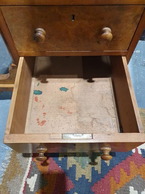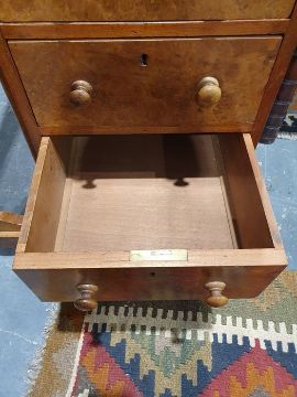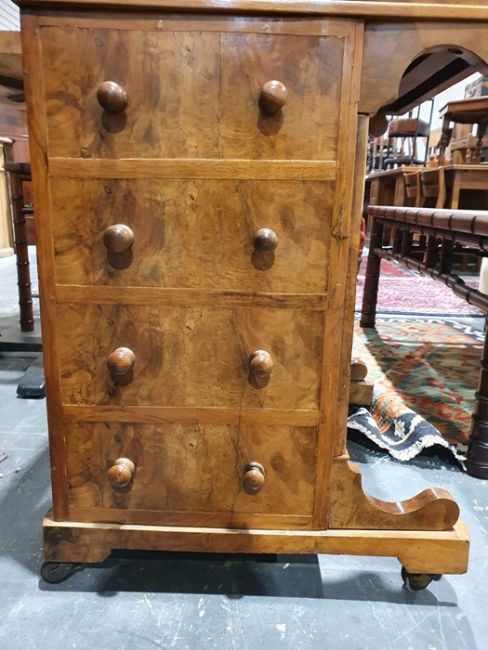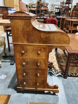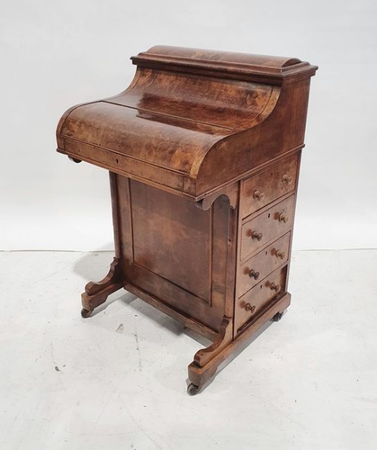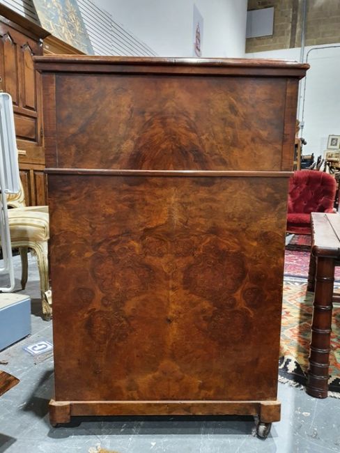 Victorian burr walnut davenport desk with rising back, fitted interior, four drawers, kneehole cupboard, whole raised on brown china castors, 58.5 x92cmCondition ReportNumerous light surface scratches, scuffs and knocks/dents to the wood.  An area of loss to the back of the top interior stationary drawer. Area of wear to the top of the lid.  Some splits to the veneer/wood to the side with false drawers.  Possibly some areas of fading and discolouration.  Wear and scratches to the interior leather.  Some stains to the interior of the bottom drawer.  See photos. Pop-up section works.Victorian, possibly late Victorian.