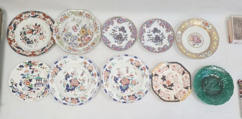 Collection of Staffordshire Ironstone pottery and porcelain, early to late 19th century, printed and impressed marks, including a group of Oriental 'Japan' pattern side plates, a pair of Copeland chinoiserie and gilt pattern side plates, a Coalport 'Church Gresley' style plate (restored) and further assorted plates and dishes