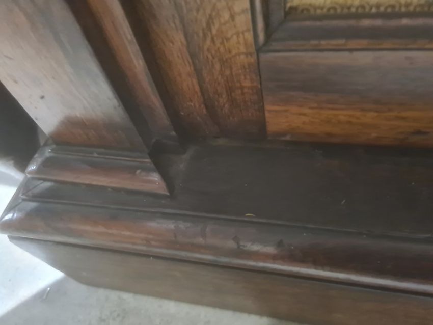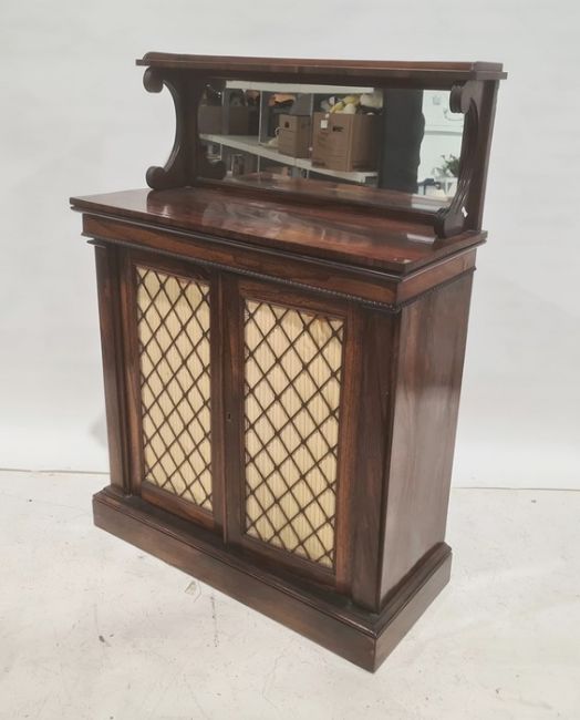 Victorian rosewood chiffonier, the top with three-quarter galleried shelf above mirror back, two cupboard doors, on plinth base, 90.5cm x 125.5cmCondition ReportThere is some loss to the base section on both sides. The top on the left appears to be out. There is a small split to the top. The doors do not appear to be warped. The interior depth is 28cm. There are some scratches to the polish as well as a cup stain. Please see attached images.