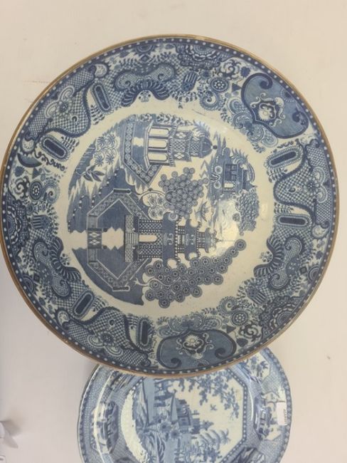 Collection of Staffordshire pearlware, early 19th century, comprising a chinoiserie pavilion pattern punch bowl, 27cm dia., an octagonal plate, a basket moulded Willow pattern plate and a plate printed with chinoiserie figures before island and a building(4)