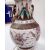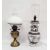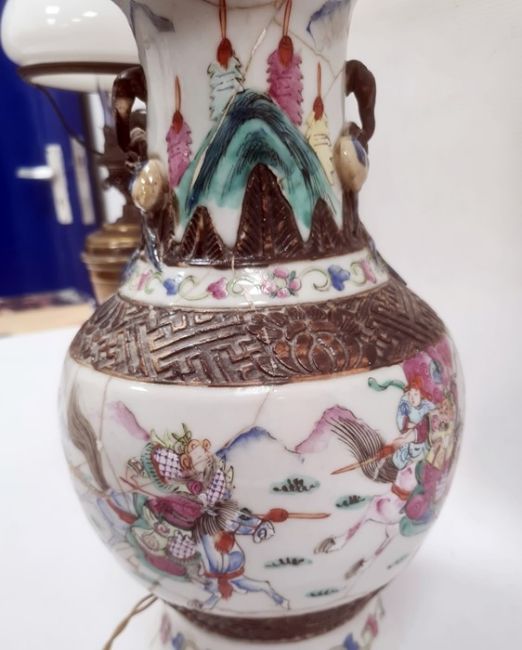 Oriental porcelain vase table lamp, baluster-shape, decorated with samurai warriors (damaged) and a brass table lamp with white glass opaline shade and chimney and the pink pleated shade (2)