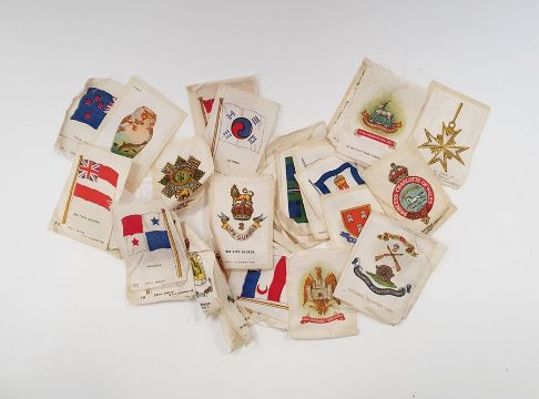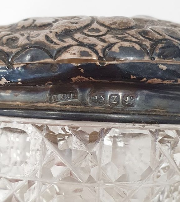 Cut glass dressing table jar with silver cover, a silver coloured compact of square form engraved with flowers, marked 833 and a Queen Mary Christmas 1914 brass tin containing a number of cigarette silks with regimental crest