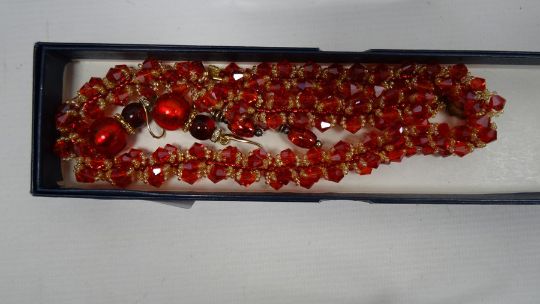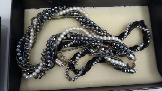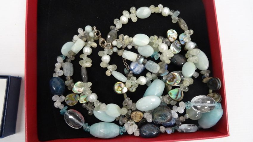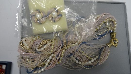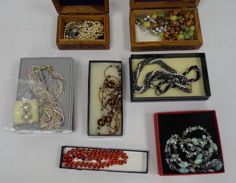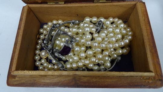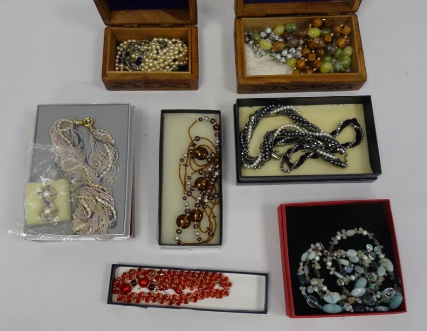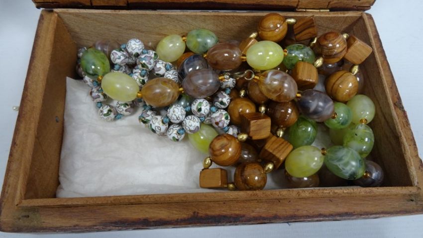 Carved hardwood box and contents including cloisonne enamel beads and other items of costume jewellery including hardstone beads, glass bead necklaces, simulated pearls, etc