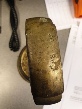 Large brass bell weight and two Oriental bronze-effect vases (3) Condition ReportThe weight weighs approximately 6.3kg. (Markings pictured).