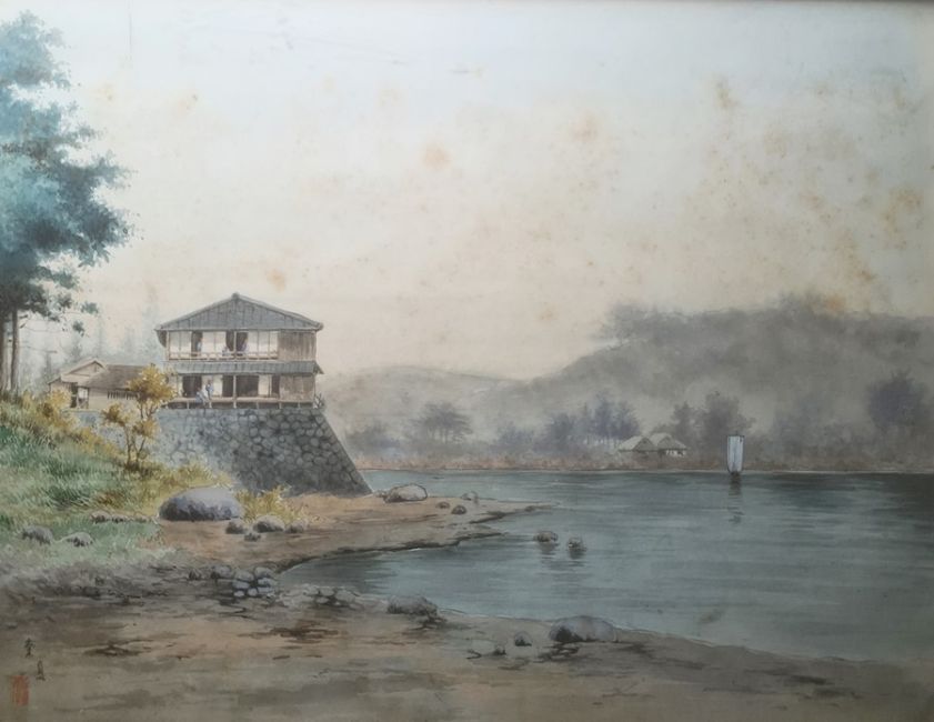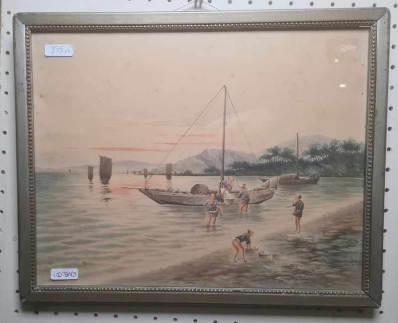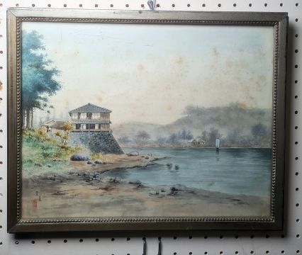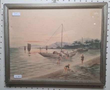 Chinese schoolWatercolour drawingsFishermen at the water's edge unloading fish, 23cm x 29.5cm Lakeside scene, with signature and sealmark, 23cm x 29.5cm Figure and mule on a bridge, signed and with sealmark (3)