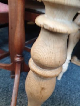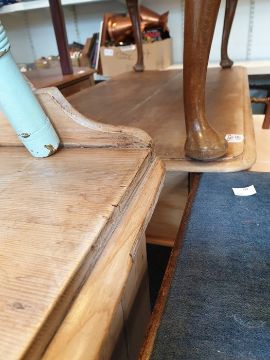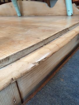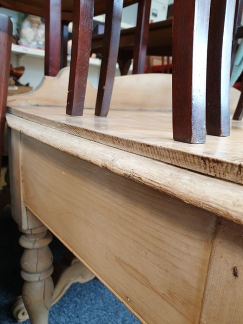 Late 19th/early 20th century pine washstand with galleried back, rectangular top, rounded front corners, two drawers, on turned legs and peg feet, 119cm wideCondition ReportSurface wear, marking and scratching throughout.Dents to legs.Several chips/losses to top rim.Split in one drawer face and a lose knob on the other.