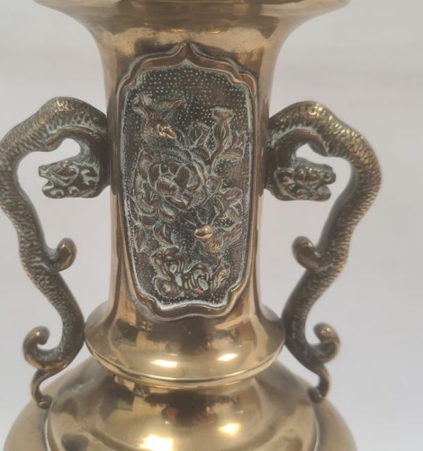 Asian brass two-handled vase, embossed bird and plant decoration and having dragon handles, 38cm high