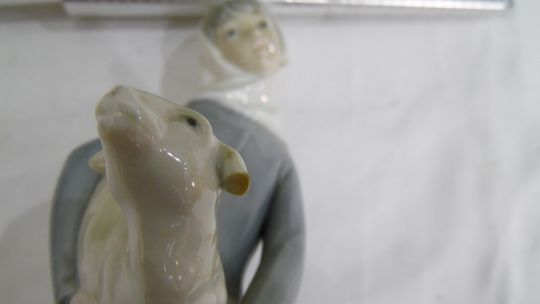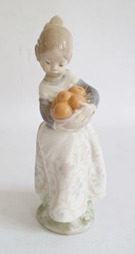 Lladro porcelain group of boy in nightshirt with puppy, 20cm high, Lladro girl with lamb and another with bowl of fruit (3) Condition ReportThe lamb is missing one ear and the girl holding said lamb has damage at base. See photos