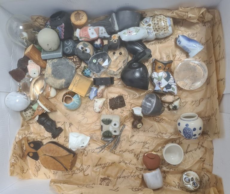 Assorted metal, glass and ceramic owl ornaments