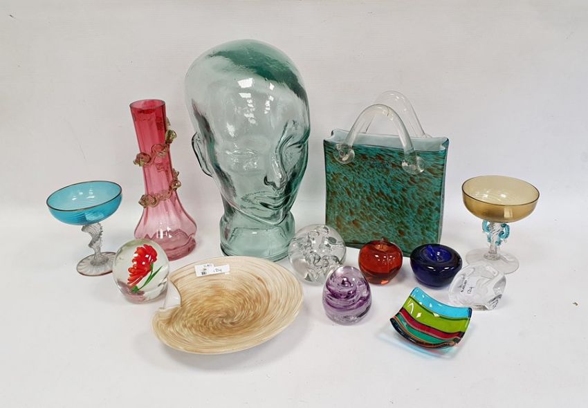 Blue and ochre mottled handbag-shaped glass vase, an aqua glass female bust, a cranberry vase, six various paperweights and other coloured glass
