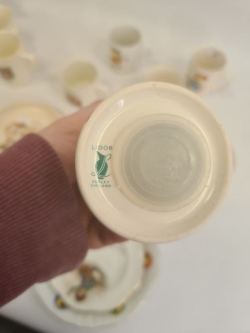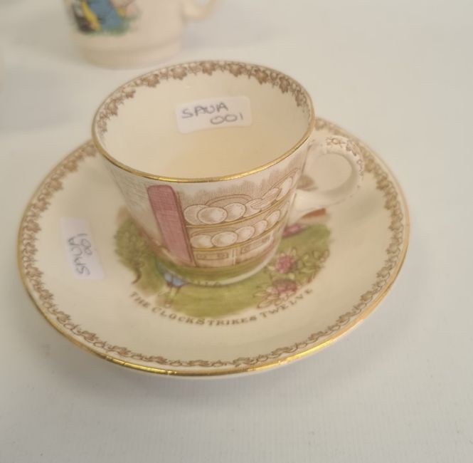 Collection of nurseryware pottery mugs, circa 1930 and later, variously printed and painted with nursery rhymes comprising ten mugs, a Lidor moneybox, two Tuscan china plates, a Bavarian porcelain rabbit pattern dish, a Cinderella pattern teacup and saucer, three trinket boxes and covers and a Brentleigh ware Baby ware dog bowl, 18cm dia.