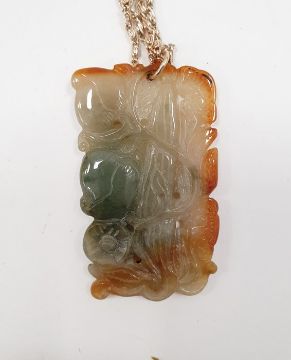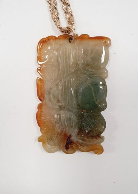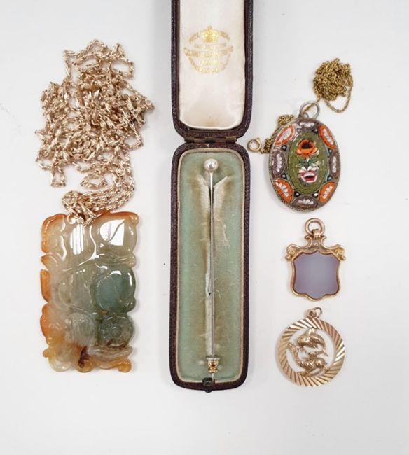 9ct gold pendant of circular form depicting a pisces emblem, approx. 2.2g, a 9ct gold fob of shield design set with agate tablets (engraved), a micromosaic pendant, a carved jade pendant of rectangular form carved with fruit blossom, etc.
