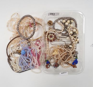 Single Victorian gilt metal pendant earring modelled as an acorn with wirework decoration suspended from engraved leaves, a pair of paste drop earrings, a seagull brooch and a quantity of further costume jewellery including beads, clip-on earrings, rolled gold locket etc.