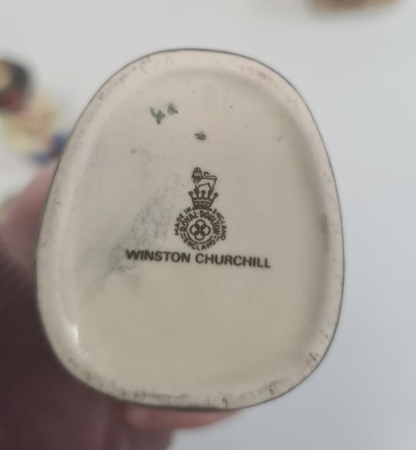 Royal Doulton 'Old Curiosity Shop' pattern jug, 14cm high, a 'Night Watchman' teapot and cover, a Winston Churchill Toby jug and a 'The Clown' Toby jug D6935, limited edition 2363/3000, various printed marks (4)