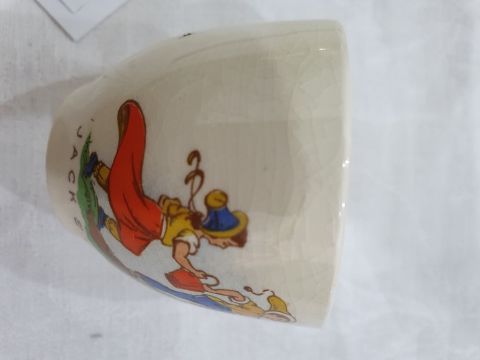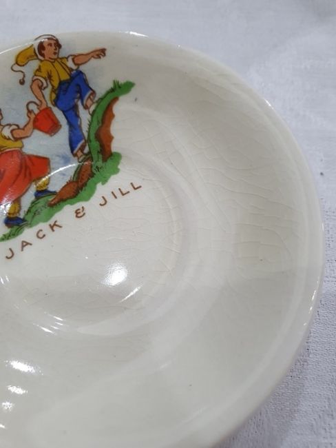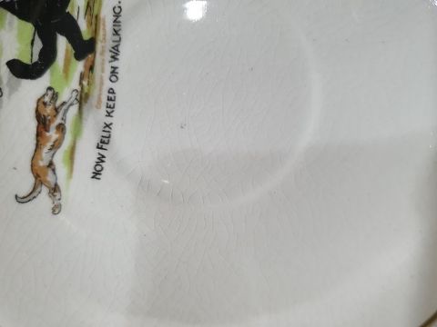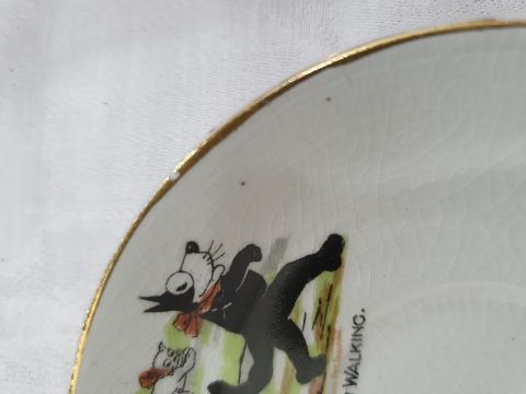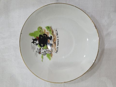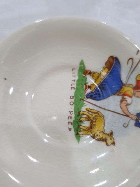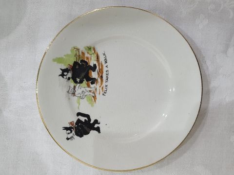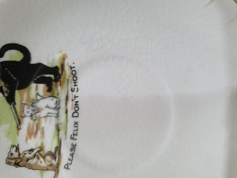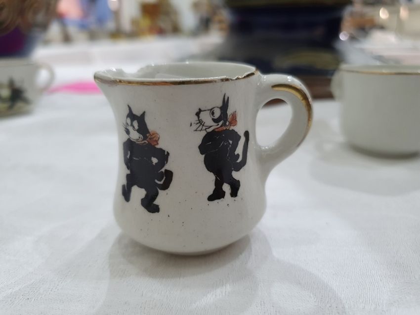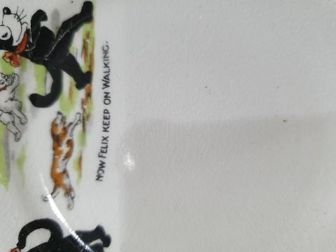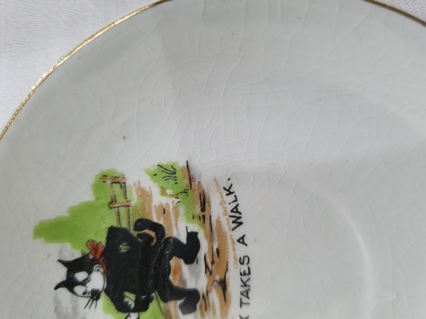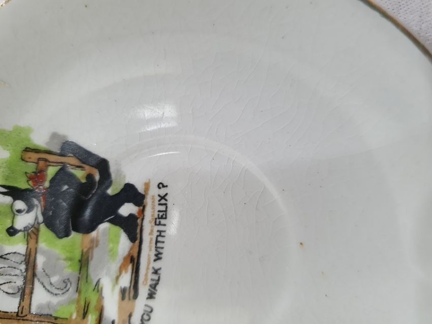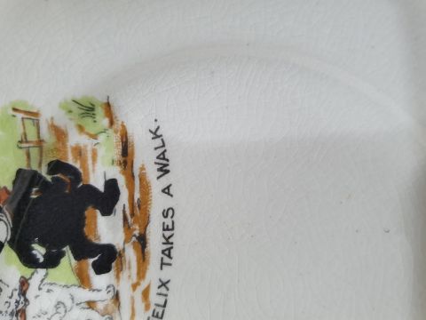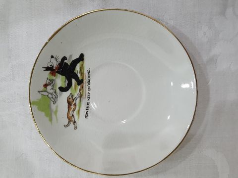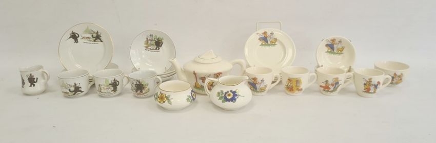 Assorted pottery part doll's tea services, circa 1930 and later, the first printed with Ride-a-Cock horse, Little Bo Beep, Jack and Jill, comprising a teapot and cover, a sugar bowl, four tea cups, four saucers, four side plates together with a Felix the Cat pattern part doll's service, comprising a milk jug, three tea cups and four saucers, four side plates, together with a Crown Ducalware miniature milk jug and small vaseCondition ReportThe teapot has some light surface scratches and crazing. All nursery rhyme pieces have crazing.Crown Ducal cream jug has a chip to the underside of the lip and wear to the decoration.  The crown ducal bowl has some wear to the decoration and some surface marks. All Felix items have crazing, some have wear to the decoration and gilt. Some light surface marks.  There are 2 chips to the rim of the milk jug and a possible hairline crack to one the cups.  See photos.
