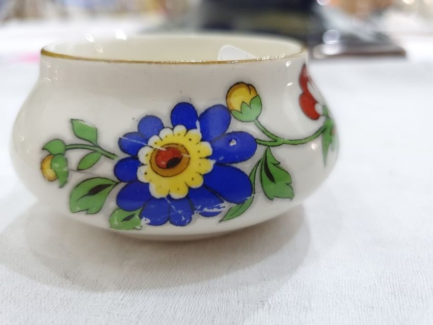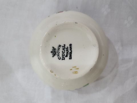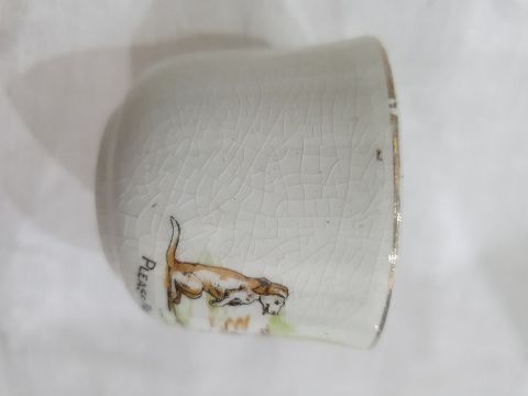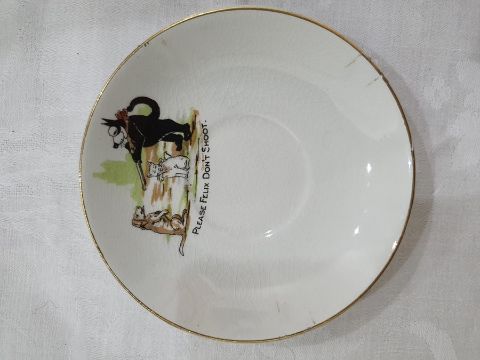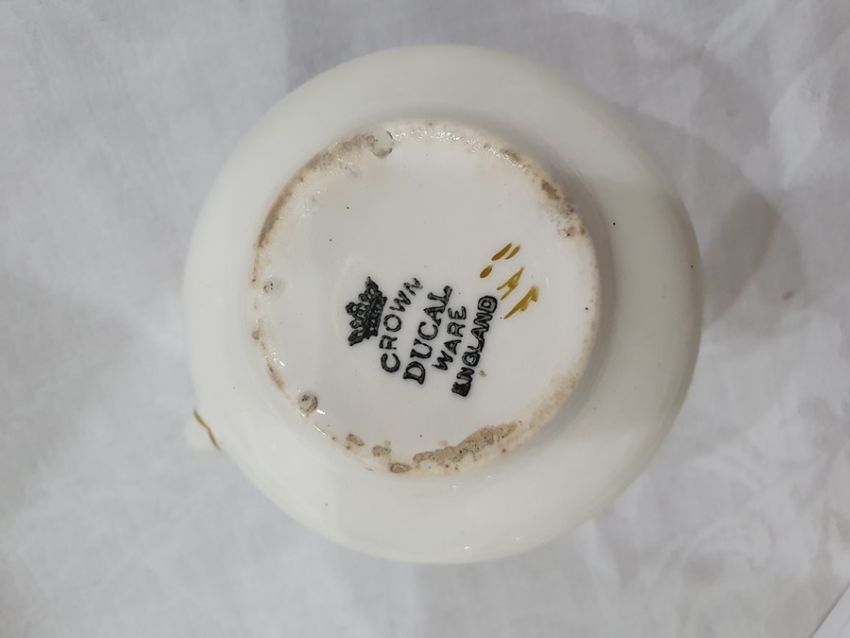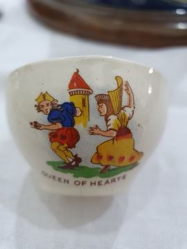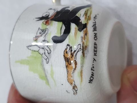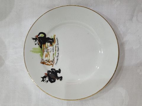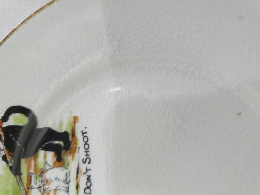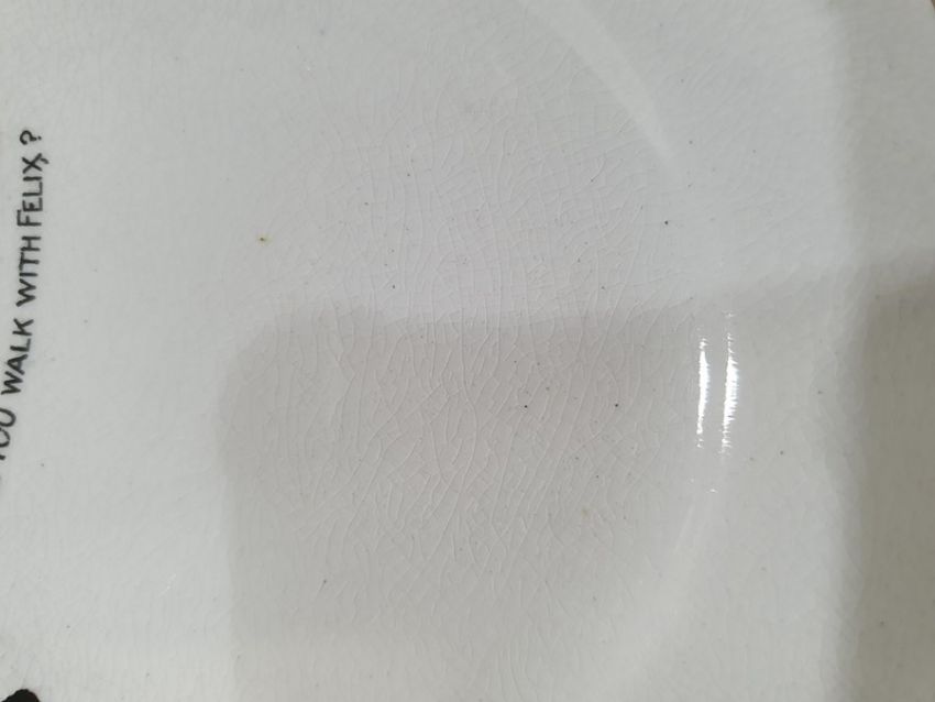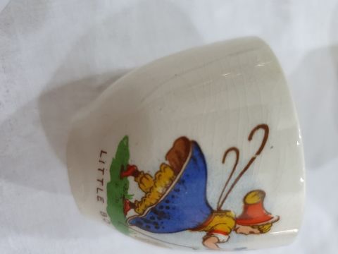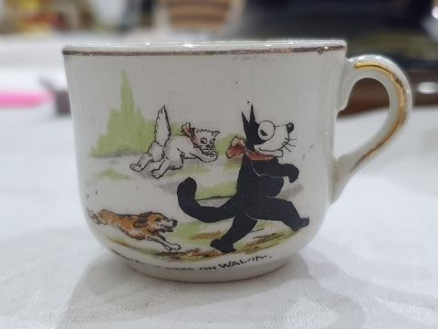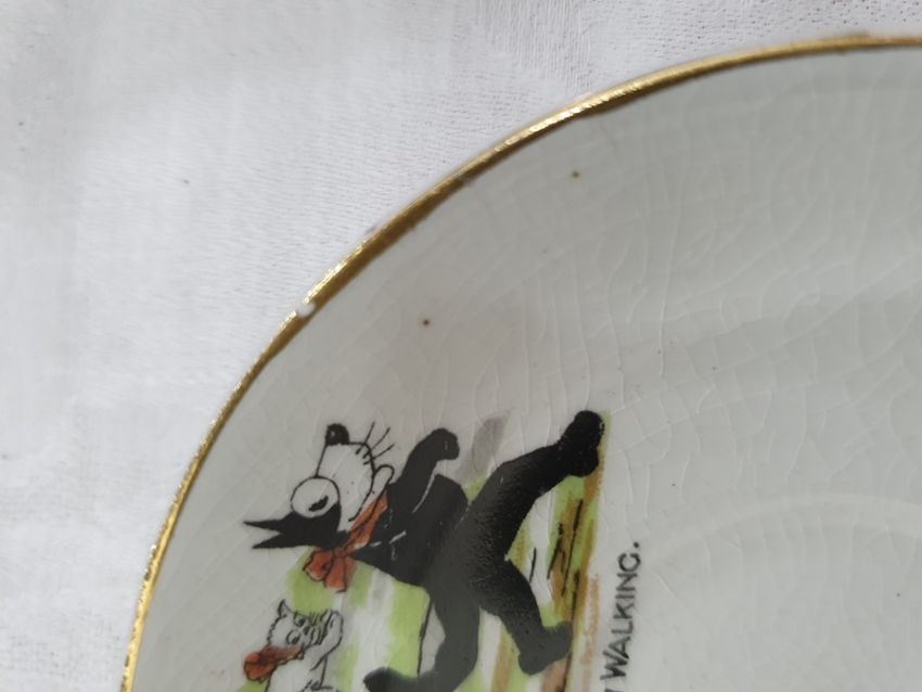 Assorted pottery part doll's tea services, circa 1930 and later, the first printed with Ride-a-Cock horse, Little Bo Beep, Jack and Jill, comprising a teapot and cover, a sugar bowl, four tea cups, four saucers, four side plates together with a Felix the Cat pattern part doll's service, comprising a milk jug, three tea cups and four saucers, four side plates, together with a Crown Ducalware miniature milk jug and small vaseCondition ReportThe teapot has some light surface scratches and crazing. All nursery rhyme pieces have crazing.Crown Ducal cream jug has a chip to the underside of the lip and wear to the decoration.  The crown ducal bowl has some wear to the decoration and some surface marks. All Felix items have crazing, some have wear to the decoration and gilt. Some light surface marks.  There are 2 chips to the rim of the milk jug and a possible hairline crack to one the cups.  See photos.