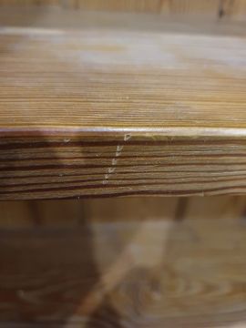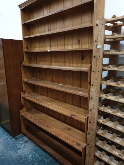Large pine waterfall bookcase of seven shelves, moulded cornice, plinth base, 140cm x 223cmCondition ReportThere is some minor denting and scratches, as well as slight gaps at the joint of the shelves. (Pictures Included).