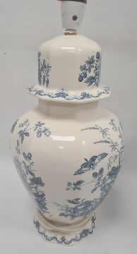 Pair of Masons ironstone fruit basket pattern lamps in blue, 20th century printed marks, of octagonal section with integral domed covers, electrofied, 44cm high including fittings (2)