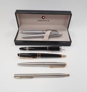 Modern Sheaffer fountain pen and biro set both with brushed metal cases and in fitted case, a  Mont Blanc pen and various others