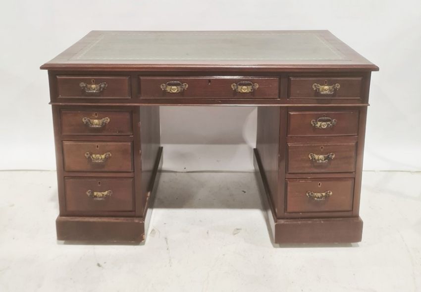 20th century mahogany pedestal desk with green leather inset top, nine assorted drawers, on plinth base, 118cm wide