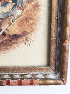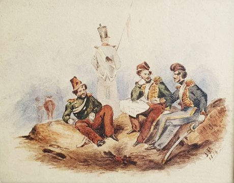 19th century school Watercolour drawingHead and shoulders portrait of military gentleman,  9cm x 7cm JTMiniature watercolour Group of Napoleonic soldiers seated and conversing, initialled and dated 1834, 8cm x 10cm (2)Condition ReportFrom a local estate.Signature of miniature watercolour pictured.