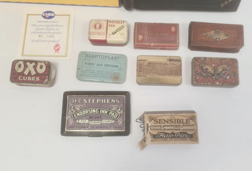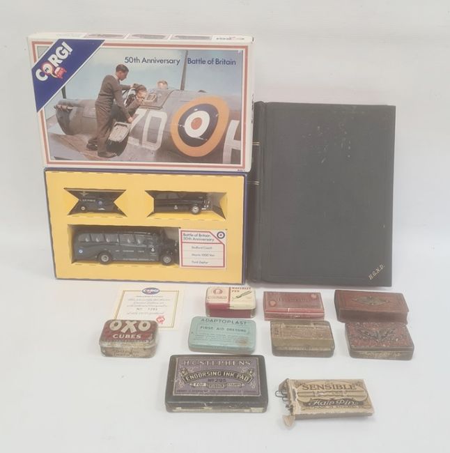 Quantity vintage small tins, OXO Cubes Waverley pen and others, a vintage ledger and a Corgi 50th anniversary Battle of Britain Bedford coach, Morris 1000 van and Ford Zephyr, boxed