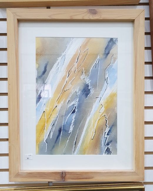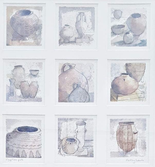 Kathy Lewis (20th century) Watercolour drawing "Egyptian Pots", titled and signed in pencil, nine small watercolours each approx 8.5cm x 8cm, framed as one Iris Capps (21st century) Watercolour drawingAbstract blues and browns, 37cm x 26cm (2)