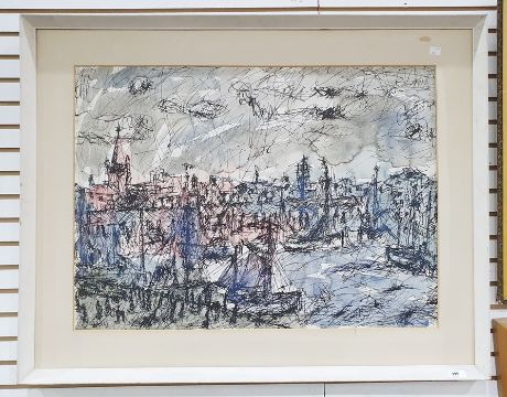 O Hall (?)Pen, ink and washHarbour scene with numerous sailing boats, signed indistinctly lower left, 56cm x 76cm
