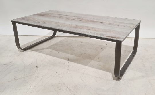 Glass-topped rectangular coffee table on black metal base, 104.5cm wide
